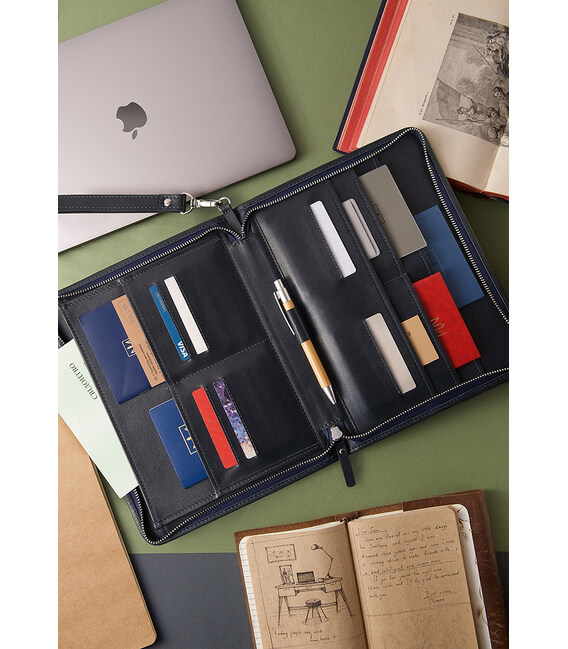 Описание Кожаная папка для документов "Семейная" на молнии Премиум Темно-синяя