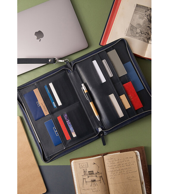 Кожаная папка для документов "Семейная" на молнии Премиум Темно-синяя