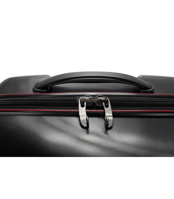 В чемодана есть 2 отделения: одно с фиксирующими ремнями, другое закрывается на молнию. Сверху и сбоку чемодана расположены стационарные ручки для ручного переноса в вертикальном или горизонтальном положениях. Имеется выдвижная телескопическая ручка на металлической основе с кнопкой для фиксации высоты.
