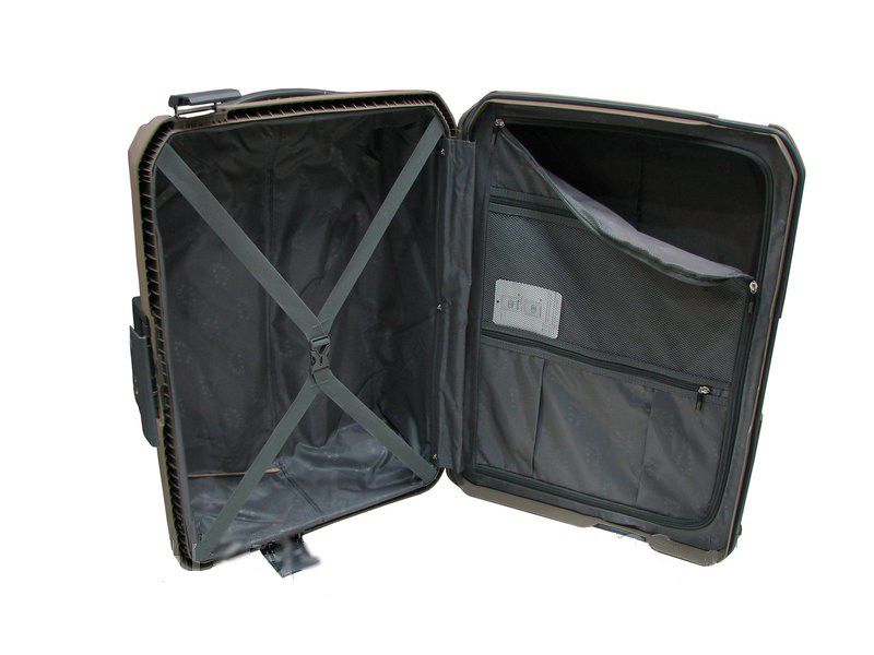 В чемодана есть 2 отделения: одно с фиксирующими ремнями, другое закрывается на молнию. Сверху и сбоку чемодана расположены стационарные ручки для ручного переноса в вертикальном или горизонтальном положениях. Имеется выдвижная телескопическая ручка на металлической основе с кнопкой для фиксации высоты.