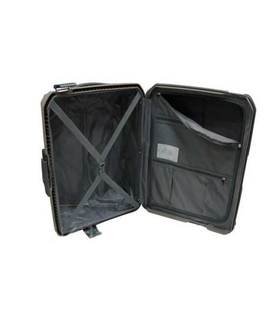 Чемодан изготовлен из прочного и легкого материала - полипропилен, который характеризуется высокой гибкостью и устойчивостью к механическим повреждениям, что является важным фактором во время авиаперелетов.