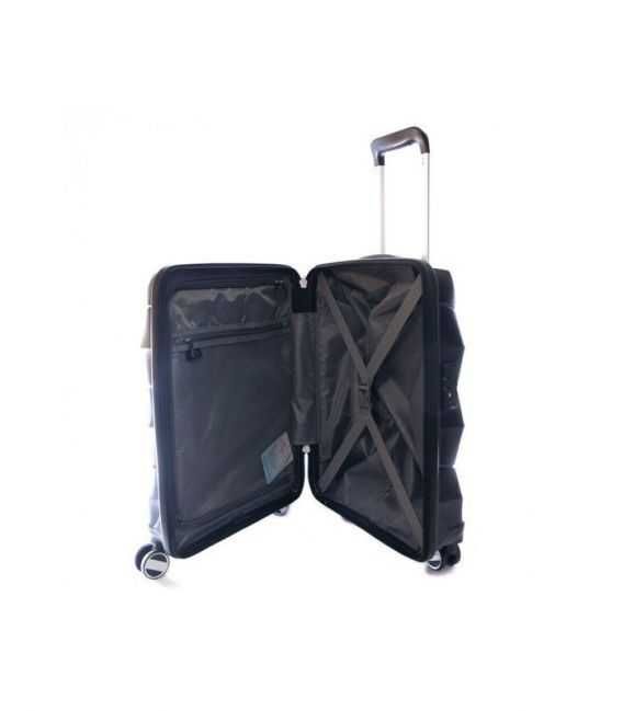 В чемодана есть 2 отделения: одно с фиксирующими ремнями, другое закрывается на молнию. Сверху и сбоку чемодана расположены стационарные ручки для ручного переноса в вертикальном или горизонтальном положениях. Имеется выдвижная телескопическая ручка на металлической основе с кнопкой для фиксации высоты.