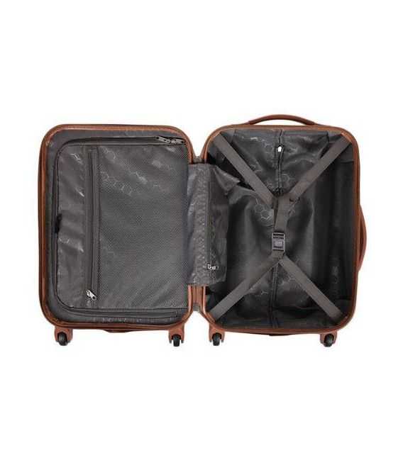 В чемодана есть 2 отделения: одно с фиксирующими ремнями, другое закрывается на молнию. Сверху и сбоку чемодана расположены стационарные ручки для ручного переноса в вертикальном или горизонтальном положениях. Имеется выдвижная телескопическая ручка на металлической основе с кнопкой для фиксации высоты.