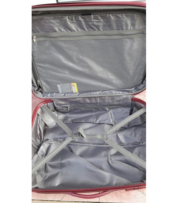 В середине чемодана есть 2 отделения которые закрываются на молнию. Сверху и сбоку чемодана расположены стационарные ручки для ручного переноса в вертикальном или горизонтальном положениях. Имеется выдвижная телескопическая ручка на металлической основе с кнопкой для фиксации высоты.
