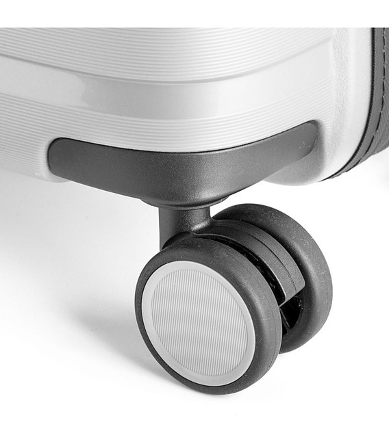4 двойных колеса с основой из ТПУ (термополиуретан) креплением из стали и инновационной (без шурупов) системой крепления колесного блока к корпусу (максимум надежности при эксплуатации и сдаче в багаж).