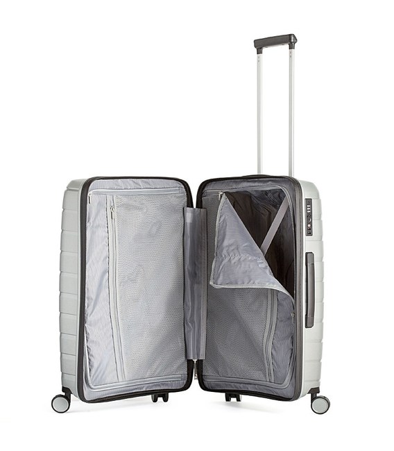 Материал корпуса -100% полипропилен, один из лучших материалов применяемых при производстве дорожных чемоданов. Представленная модель – разработка и гордость компании. Основная часть корпуса чемодана армирована нитью из стекловолокна – высочайшая устойчивость к деформации и истиранию.