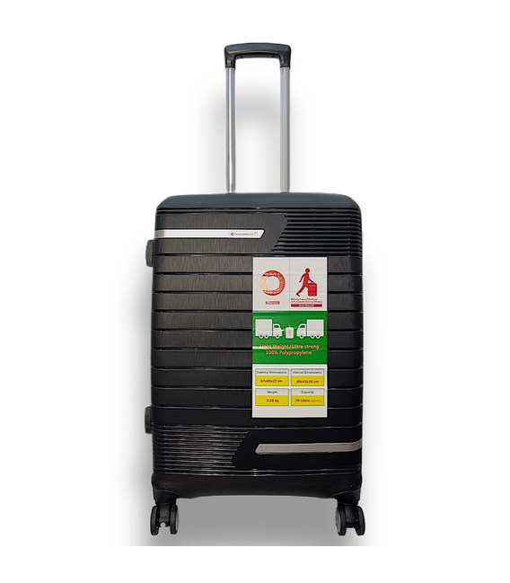 Материал корпуса -100% полипропилен, один из лучших материалов применяемых при производстве дорожных чемоданов. Представленная модель – разработка и гордость компании. Основная часть корпуса чемодана армирована нитью из стекловолокна – высочайшая устойчивость к деформации и истиранию.