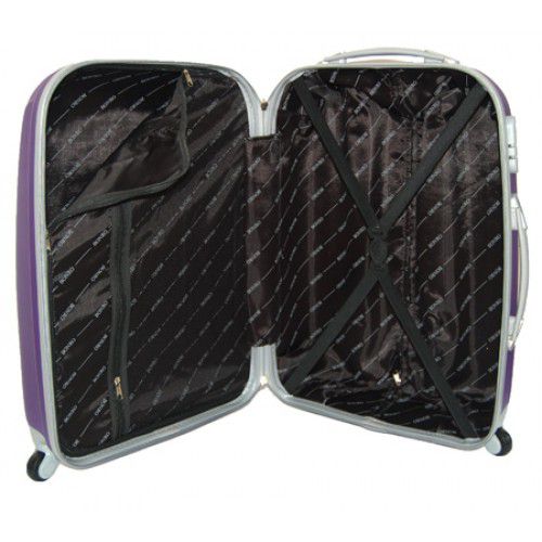 Пластиковый чемодан оснащён четырьмя поворотными колёсами на подшипниках, благодаря чему может вращаться вокруг своей оси и его легко перемещать. Внутри чемодан выложен тканевой подкладкой, предохраняющей багаж от ударов и царапин, имеет ремни и отделение на молнии, которые крепят багаж.