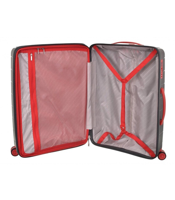 Внутри чемодан имеет два отделения: одно с ремнем для фиксации вещей, другое закрывается на молнию и имеет карманчик