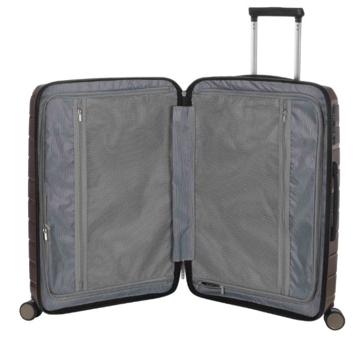 Материал корпуса -100% полипропилен, один из лучших материалов применяемых при производстве дорожных чемоданов. Представленная модель – разработка и гордость компании. Основная часть корпуса чемодана армирована нитью из стекловолокна – высочайшая устойчивость к деформации и истиранию.