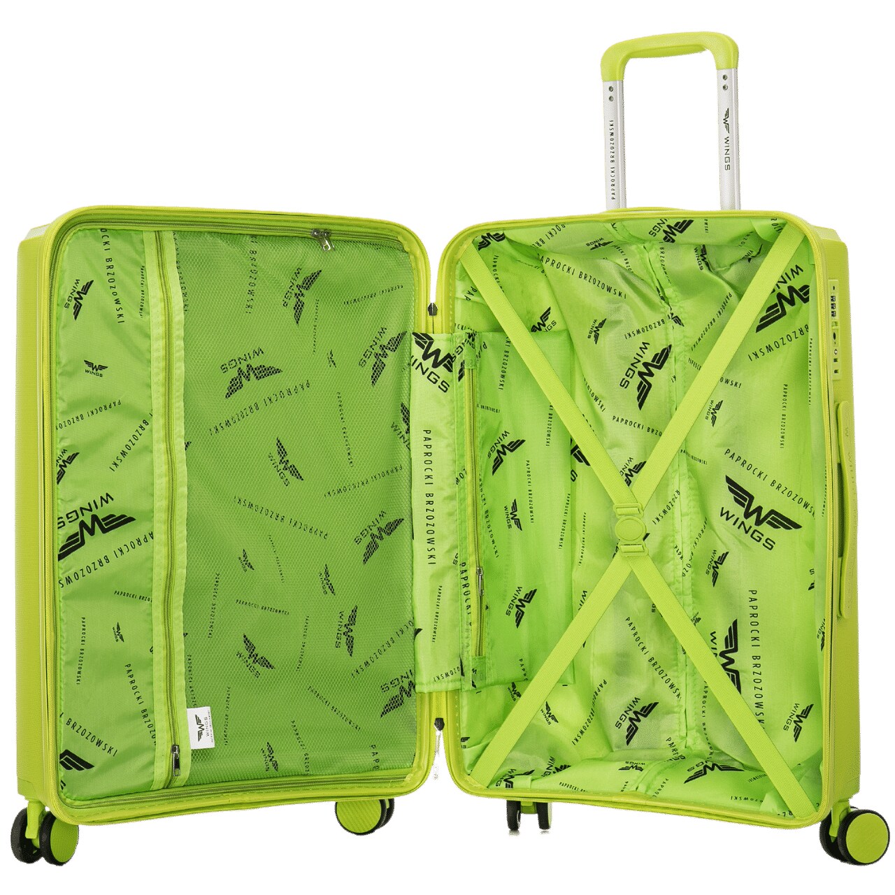 Внутреннее пространство оформлено стильной подкладкой с фирменными логотипами WINGS и PAPROCKI BRZOZOWSKI. Встроенный дополнительный карман обеспечивает быстрый доступ к мелочам, а внутренние стяжные ремни надежно фиксируют багаж.