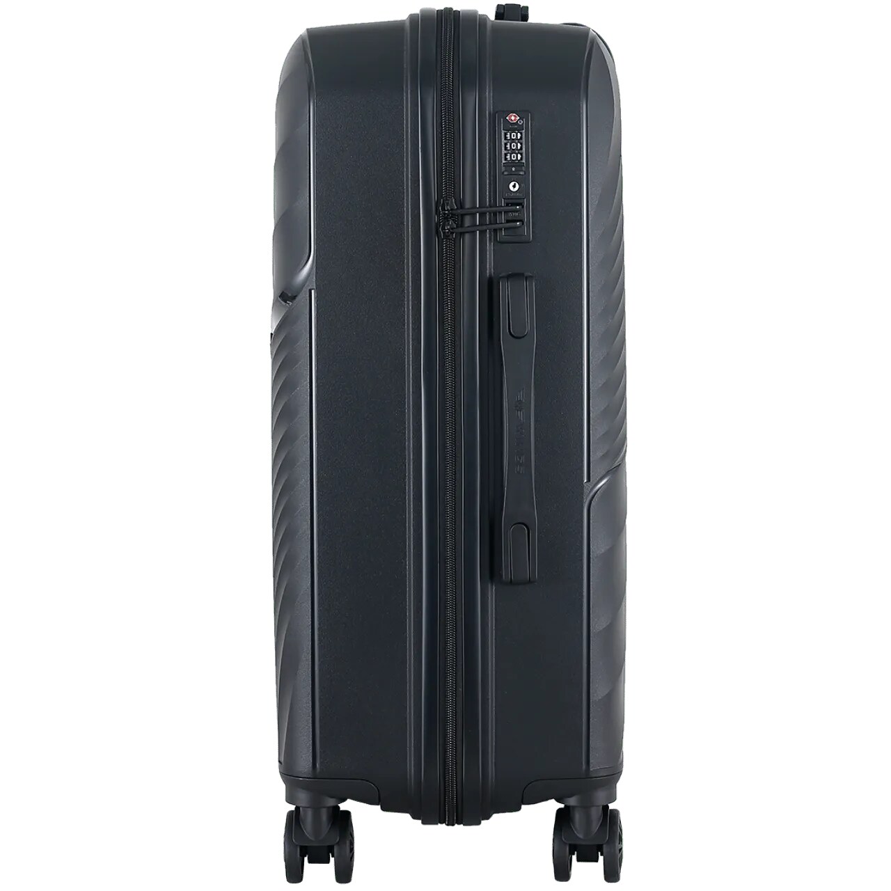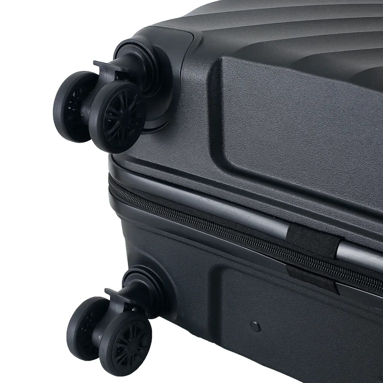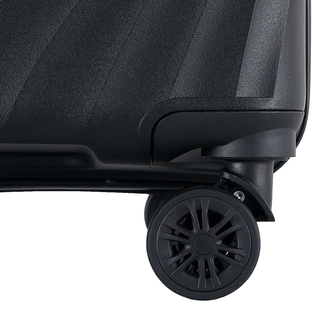 Стильный дизайн: корпус и замки выполнены в одном цвете, создавая гармоничный внешний вид. Черные контрастные элементы — резиновая защита замка, ручки, двойные колеса и телескопическая ручка — придают чемоданам современный характер.