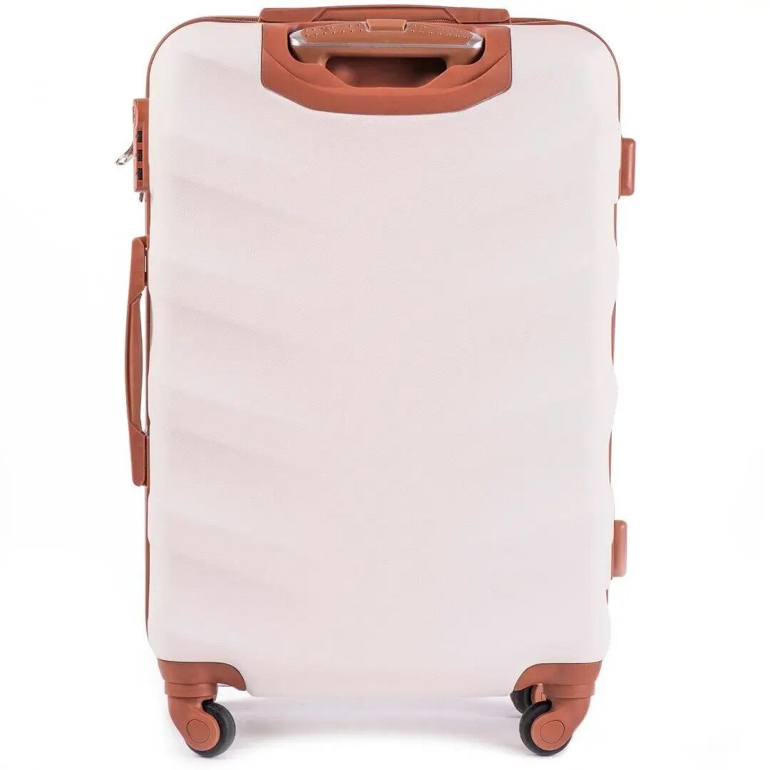 Чемодан на колесиках Wings выполнен из надежного ударопрочного сплава пластика ABS, что позволяет ему быть прочным и легким, а также испльзовать для любых путешествий. Чемодан имеет жесткую форму. Изделие закрывается на молнию. Чемодан оснащен телескопической ручкой на металлической основе и подъемной пластиковой ручкой на боковой поверхности, а также ручкой, которая расположена сверху чемодана. Четыре колеса поворачиваются на 360 градусов для удобства качения. Есть кодовый замок для сохранности вещей. Внутри изделия есть прижимные ремни для багажа. На другой боковой поверхности расположены небольшие пластиковые ножки. Чемодан обладает водоотталкивающими свойствами и стойкостью к выгоранию.