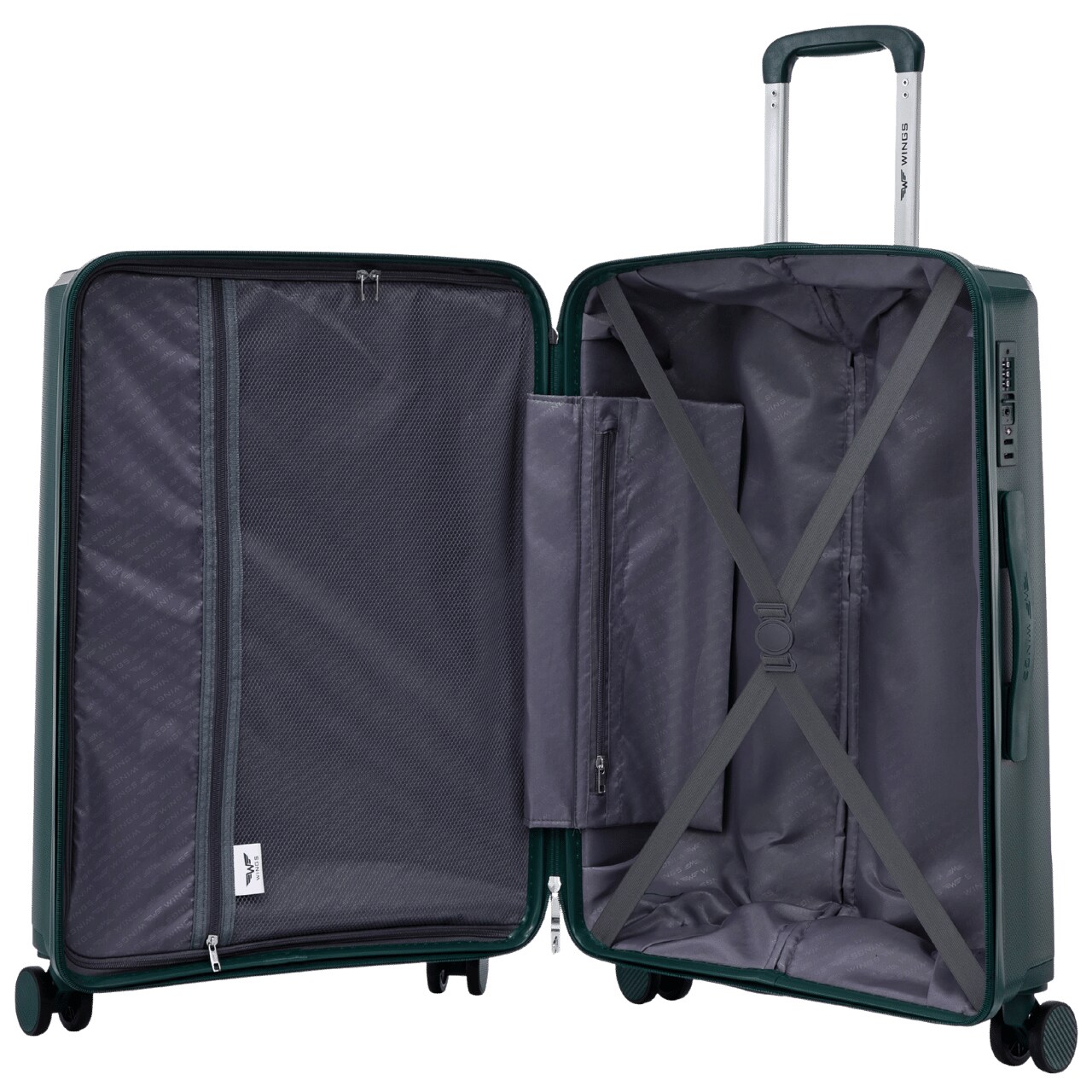 Внутреннее пространство оформлено стильной подкладкой с фирменными логотипами WINGS и PAPROCKI BRZOZOWSKI. Встроенный дополнительный карман обеспечивает быстрый доступ к мелочам, а внутренние стяжные ремни надежно фиксируют багаж.