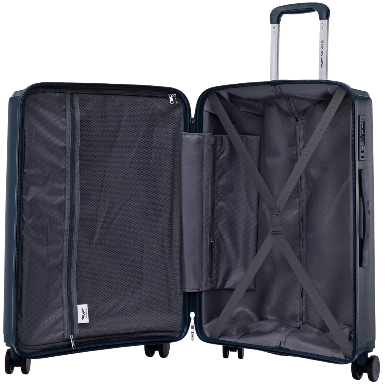 Внутреннее пространство оформлено стильной подкладкой с фирменными логотипами WINGS и PAPROCKI BRZOZOWSKI. Встроенный дополнительный карман обеспечивает быстрый доступ к мелочам, а внутренние стяжные ремни надежно фиксируют багаж.