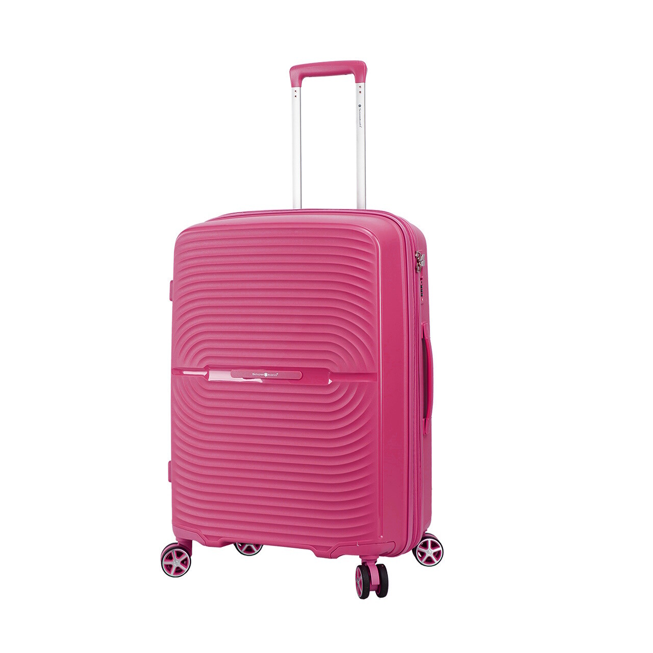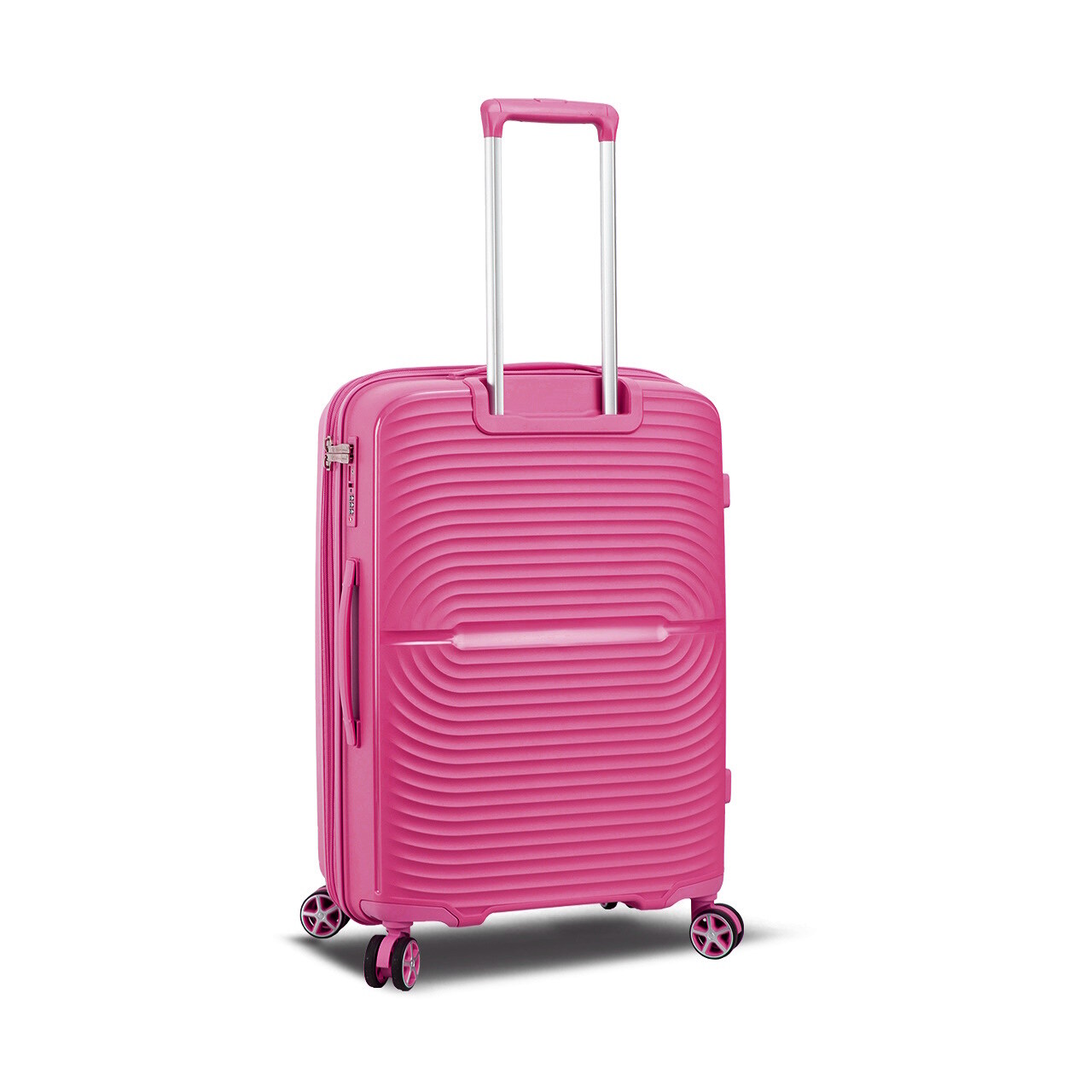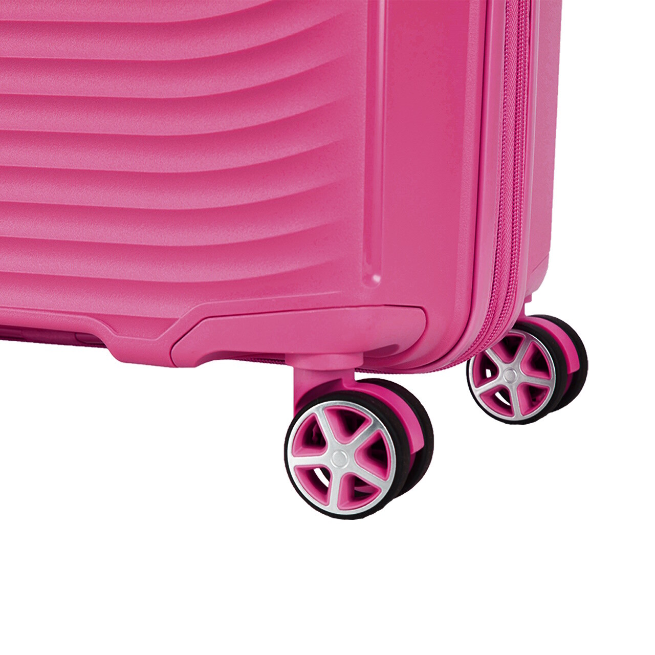 Четыре сдвоенных полиуретановых колеса вращаются на 360°, что позволяет без усилий катить чемодан в любом направлении.