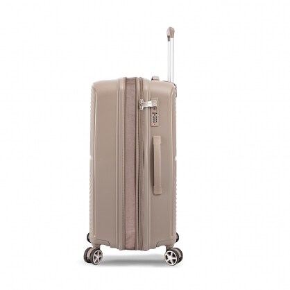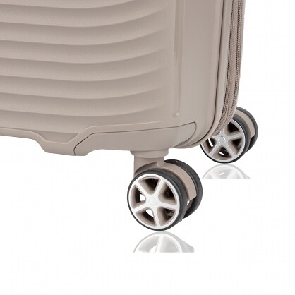 Четыре сдвоенных полиуретановых колеса вращаются на 360°, что позволяет без усилий катить чемодан в любом направлении.