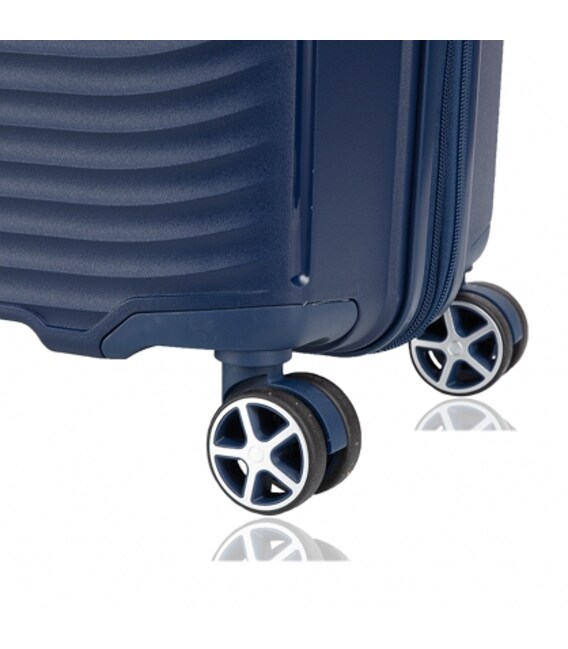Четыре сдвоенных полиуретановых колеса вращаются на 360°, что позволяет без усилий катить чемодан в любом направлении.
