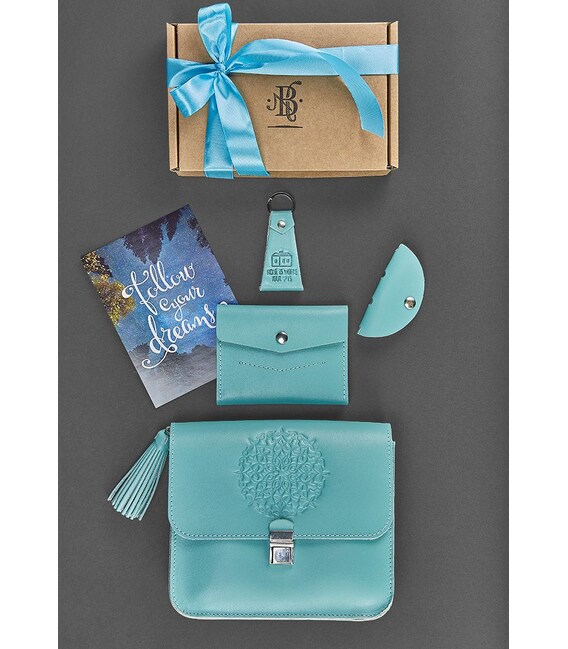 Почему стоит купить Женский подарочный набор кожаных аксессуаров Лилу Тиффани (BN-set-access-21-tiffany)?Как часто при выборе подарка мы мечемся из магазина в магазин, перерываем тонны информации на сайтах в поисках достойного подарка для друга, коллеги или члена семьи. Чтобы сделать вашу жизнь проще, а выбор подарков не утомительным, мастерская BlankNote создала подарочные наборы из самых необходимых предметов в повседневной жизни. Мы подобрали изделия, которые дополняют друг друга по функционалу, стилю, а также цветовой гамме. В набор аксессуаров “Тиффани” входит:Кожаная женская бохо-сумка Лилу бирюзовая (BN-BAG-3-tiffany) - удобство, практичность и функциональность, уместны к любому образу; Женский кожаный кошелек 2.1 бирюзовый (BN-W-2-1-tiffany) - мини-кошелек с отделением для купюр, для карточек и для мелочи; Женский кожаный брелок бирюзовый - верный спутник для ваших ключей; Дизайнерская открытка - для важных слов. Подарочный набор упакован в крафтовую коробку и заботливо перевязан атласной лентой. Все, что вам предстоит сделать, это заказать и презентовать восхитительный подарок - набор аксессуаров "Тиффани".Дополнительно на нашем сайте можно заказать услугу лазерной гравировки изделий. Памятная надпись или инициалы владельца сделают подарок особенным и уникальным.Подробнее об услуге: ПерсонализацияМеньше времени на раздумья, что подарить, больше на приятные приготовления!Фурнитура и комплектация может быть изменена производителем
