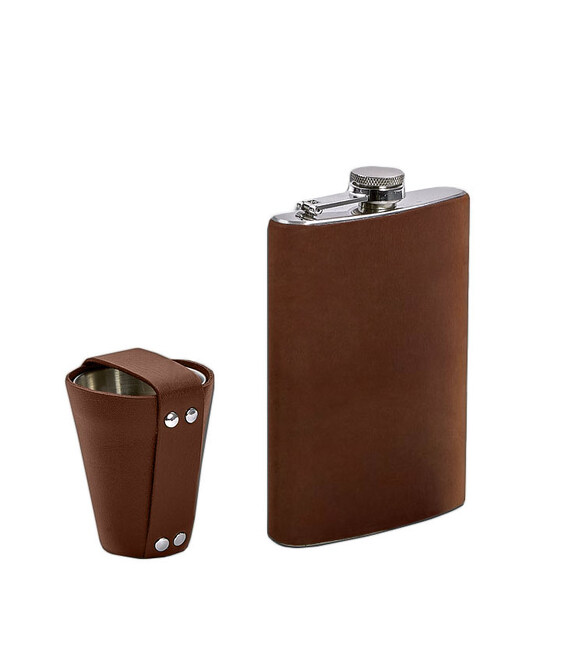 Набор с флягой и рюмками в кожаном чехле светло-коричневый Crazy Horse – (BN-FL-k-kr)Ищете подарок для человека, любящего активный отдых? Обратите внимание на наш набор с флягой и рюмками. Такой аксессуар будет уместен во время путешествия, туристического похода, рыбака, охоты и т.д. Его удобно брать с собой на природу, хранить в машине. Любимый согревающий алкогольный напиток всегда будет под рукой. Все элементы изготовлены из пищевой нержавеющей стали, которая не испортит вкус содержимого.Если получатель не принимает алкоголь, фляга и рюмки могут использоваться в качестве сувенира. Набор состоит из фляги обтянутой натуральной кожей и четырех рюмок в кожаном чехле. Компактная фляжка может содержать минимальное количество алкоголя для компании близких друзей. Натуральная кожа гармонично дополняет и подчеркивает солидный внешний вид фляги.Как заказать персонализированный подарочный набор?Мы можем предложить нанесение на поверхность кожи логотипа фирмы, изображений и надписи посредством гравировки или тиснения.Обратитесь к нашему менеджеру, если желаете заказать изделие с персонализацией.Подарочный набор фляга и рюмки – вариант символического подарка, который подойдет мужчинам с активным хобби и изысканным вкусом. Такой подарок будет напоминать о человеке и радовать функциональностью в повседневном использовании.Фурнитура и комплектация может быть изменена производителем.
