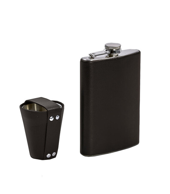 Набор с флягой и рюмками в кожаном чехле темно-коричневыйИщете подарок для человека, любящего активный отдых? Обратите внимание на наш набор с флягой и рюмками. Такой аксессуар будет уместен во время путешествия, туристического похода, рыбака, охоты и т.д. Его удобно брать с собой на природу, хранить в машине. Любимый согревающий алкогольный напиток всегда будет под рукой. Все элементы изготовлены из пищевой нержавеющей стали, которая не испортит вкус содержимого.Если получатель не принимает алкоголь, фляга и рюмки могут использоваться в качестве сувенира. Набор состоит из фляги обтянутой натуральной кожей и четырех рюмок в кожаном чехле. Компактная фляжка может содержать минимальное количество алкоголя для компании близких друзей. Натуральная кожа гармонично дополняет и подчеркивает солидный внешний вид фляги.Как заказать персонализированный подарочный набор?Мы можем предложить нанесение на поверхность кожи логотипа фирмы, изображений и надписи посредством гравировки или тиснения.Обратитесь к нашему менеджеру, если желаете заказать изделие с персонализацией.Подарочный набор фляга и рюмки – вариант символического подарка, который подойдет мужчинам с активным хобби и изысканным вкусом. Такой подарок будет напоминать о человеке и радовать функциональностью в повседневном использовании.Фурнитура и комплектация может быть изменена производителем.