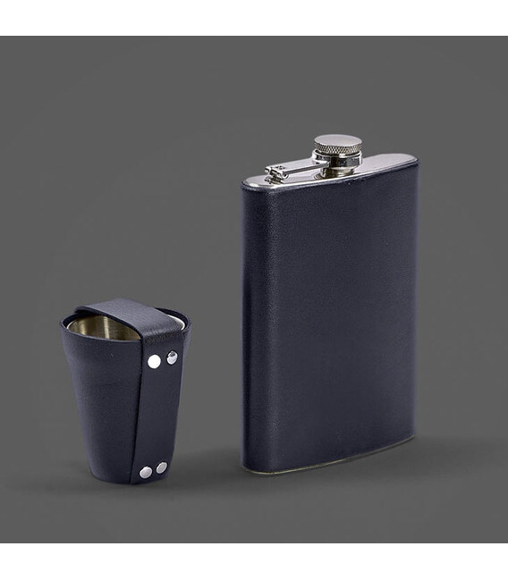 Описание Набор с флягой и рюмками в кожаном чехле темно-синий