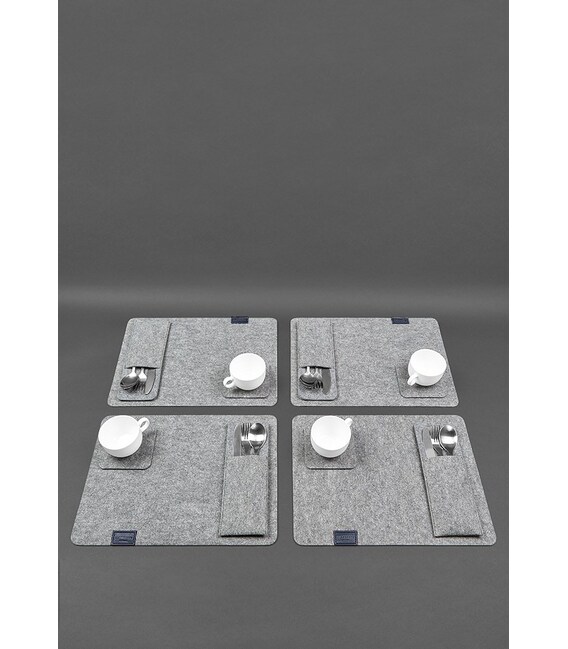Фетровый набор для сервировки стола на 4 персоныФетровый набор ручной работы для сервировки стола изготовлен из очень плотного и износостойкого эко-фетра. Такой набор будет вписываться в разные интерьеры и дизайны. Натуральный материал выгодно подчеркнет самобытность интерьера в этническом и скандинавском стиле. Лаконичный дизайн и серый цвет будут гармонично выглядеть в интерьерах в стиле лофт и хайтек. Фетр очень эффектно выглядит в сочетании с деревом, бетоном и разными металлическими поверхностями.Почему стоит купить набор для сервировки стола? Основная функция набора — защита поверхности стола от воздействия температур и механических повреждений. Набор помогает создать привлекательную и элегантную атмосферу, а также подчеркнуть особый характер события. Использование набора для сервировки упростит процесс уборки. Для чистки элементов набора используйте холодную воду и щадящие моющие средства.В комплект входит: 4 подставки под чашку 11х11 см; 4 чехла для приборов 9,5х27 см; 4 салфетки под тарелки 40х30 см;Такой набор подойдет и для домашнего пользования, и для сервировки столов в кафе и ресторанах. Наши мастера могут изготовить наборы по индивидуальному заказу в нужном дизайне и комплектации. Для корпоративных клиентов мы предлагаем специальные цены и возможность брендирования изделий.