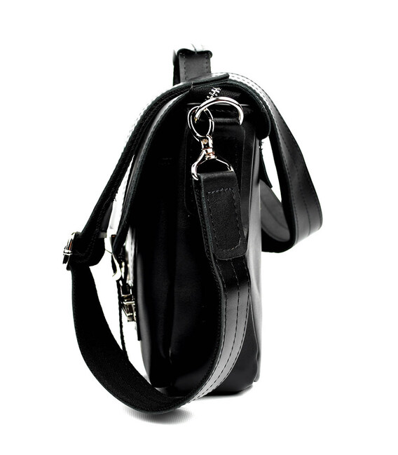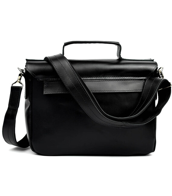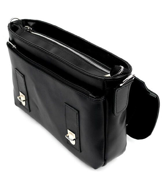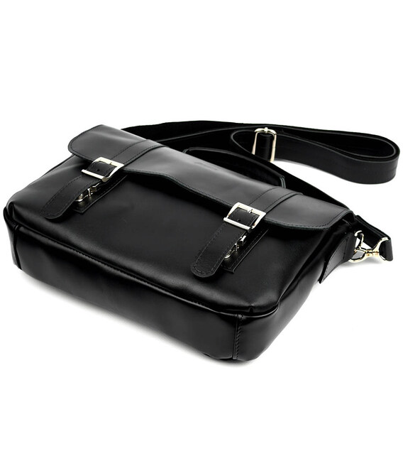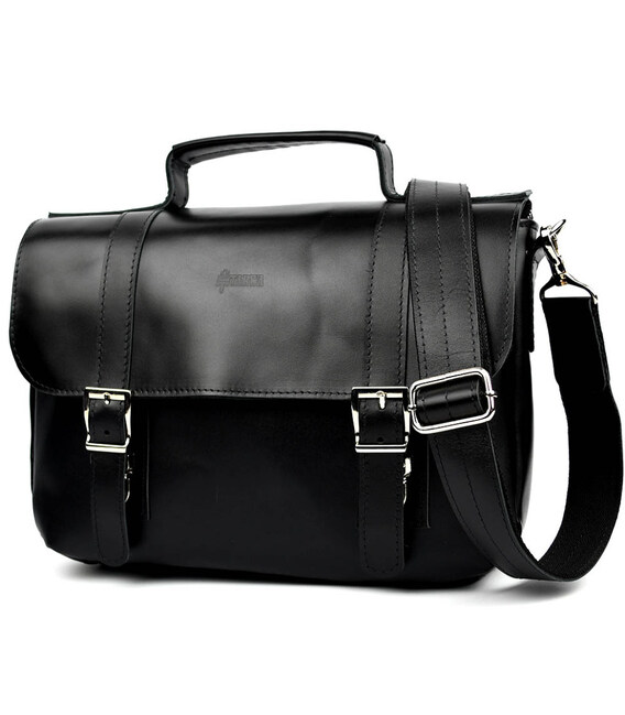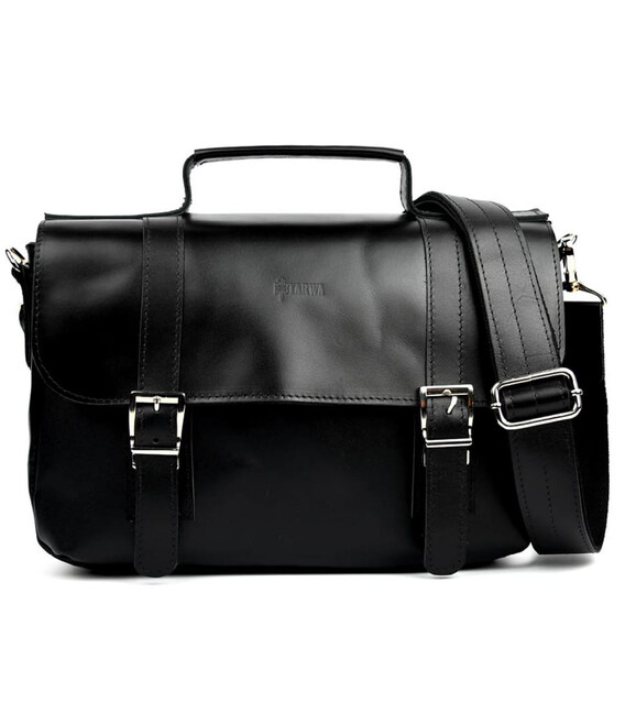 Сумка-портфель на плече з ручкою TARWA ZA-6008-3md чорна гладка шкіра Розміри: 32×25×7 см. Закривається на клапан на замках з фальш-пряжками. Може використовуватись як невеликий портфель чи сумка через плече. Ремінь на плече шкіряний, знімний.