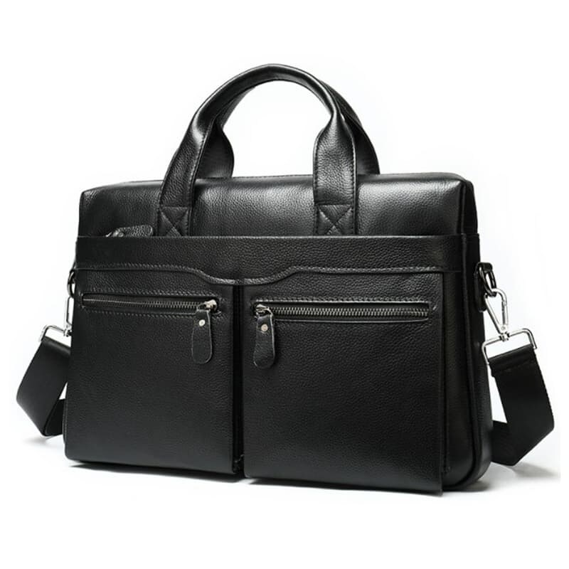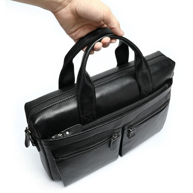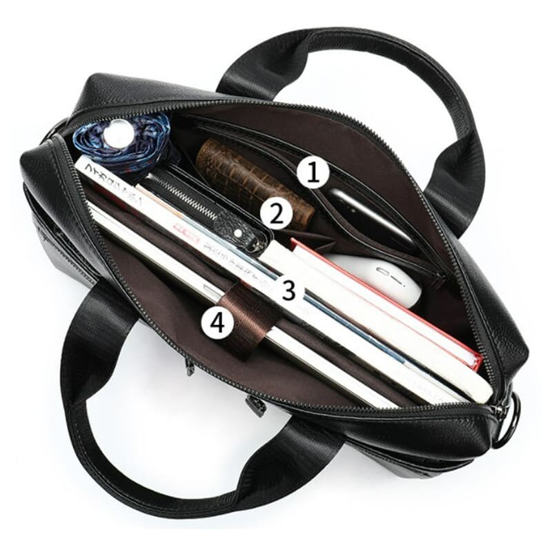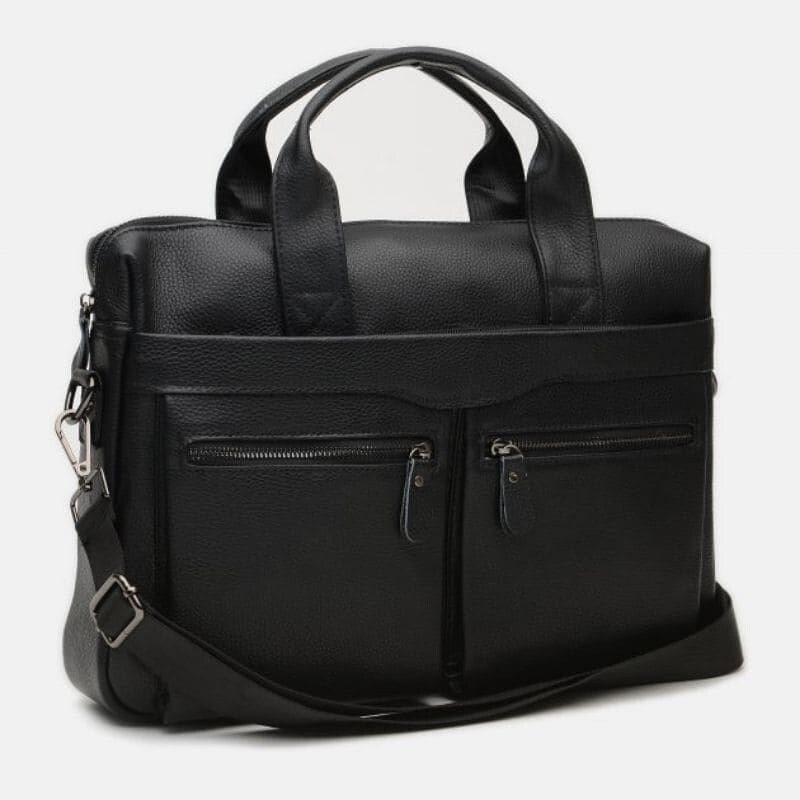 Сумка из натуральной кожи под ноутбук и документы. Закрывается на молнию. Внутри отделение под ноутбук, 2 кармана для телефона, ручек и карман на молнии. Снаружи 4 кармана на молнии. Цвет фурнитуры - серебро. Съемный текстильный плечевой ремень регулируется по длине.