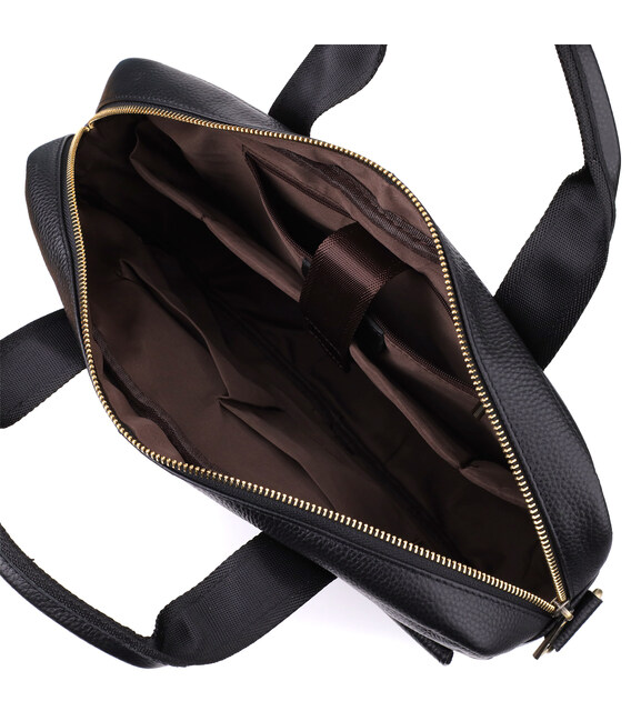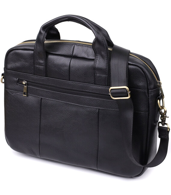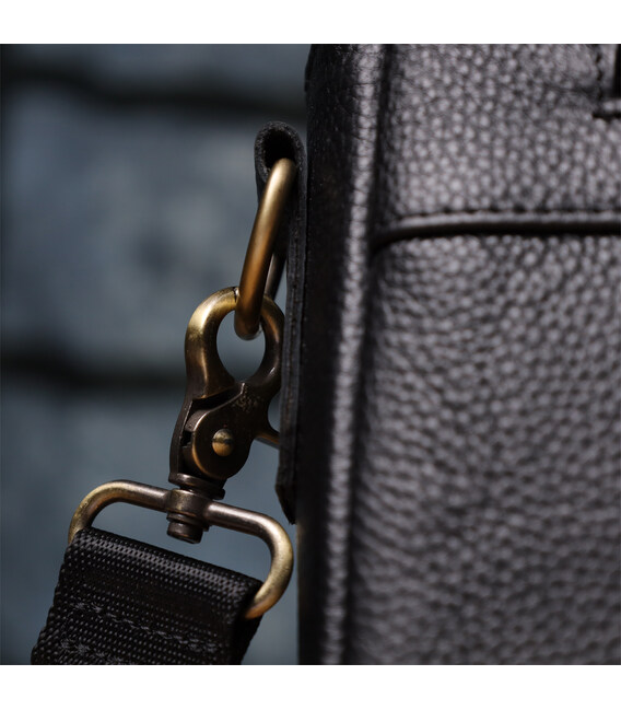 Фурнитура в оттенке "под латунь" придаёт модели благородный акцент и подчёркивает деловой характер. Для переноски предусмотрены две прочные кожаные ручки, а также съёмный регулируемый текстильный ремешок, который можно носить на плече или через плечо.