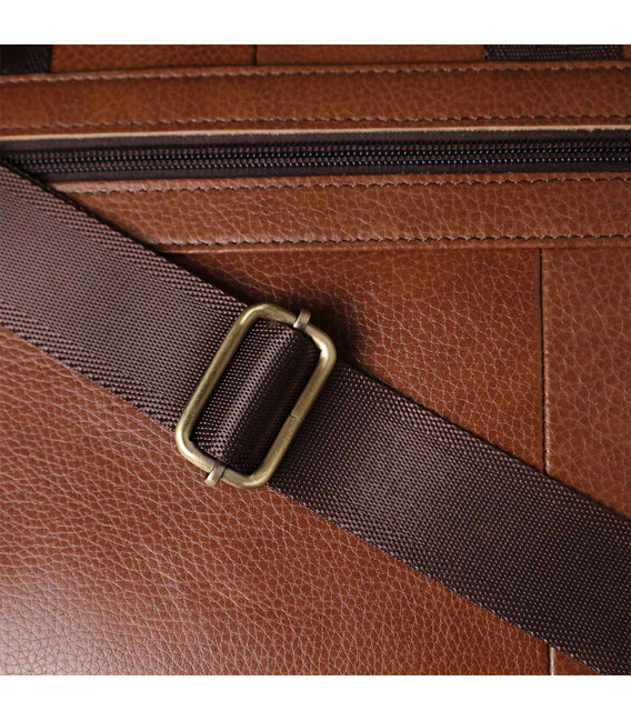 Фурнитура цвета «под латунь» придает модели солидность и изысканный внешний вид. Для удобной переноски предусмотрены две прочные кожаные ручки, а также съемный регулируемый текстильный ремень, позволяющий носить сумку на плече.