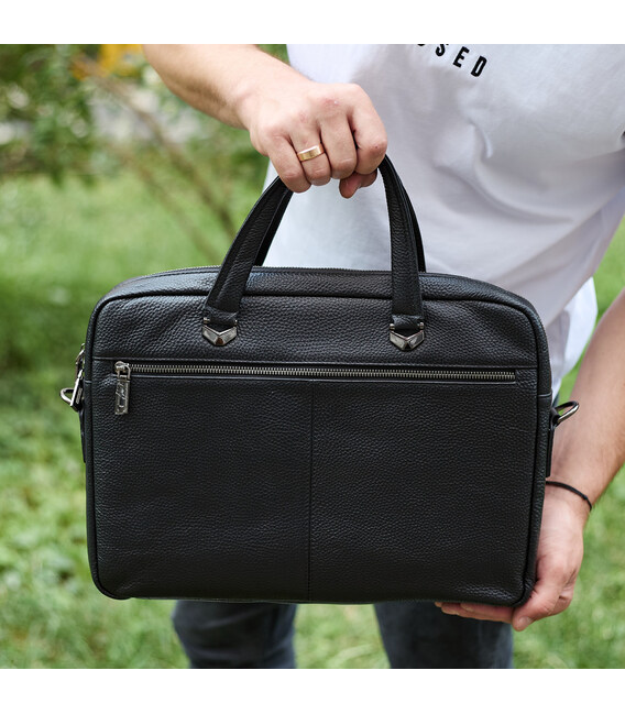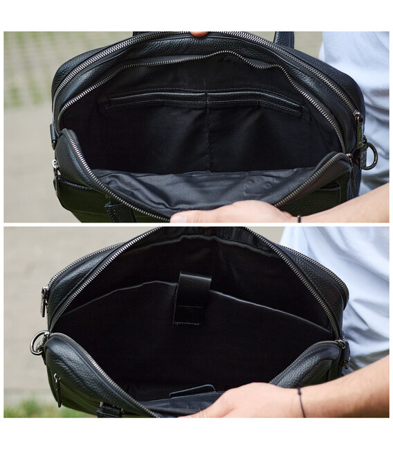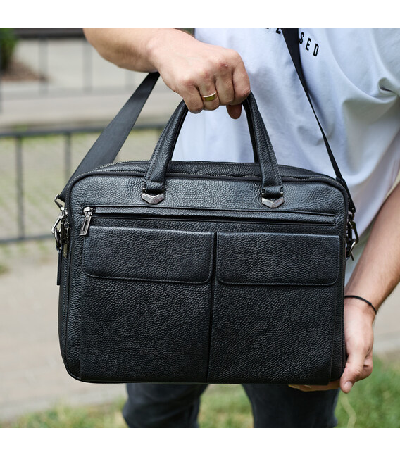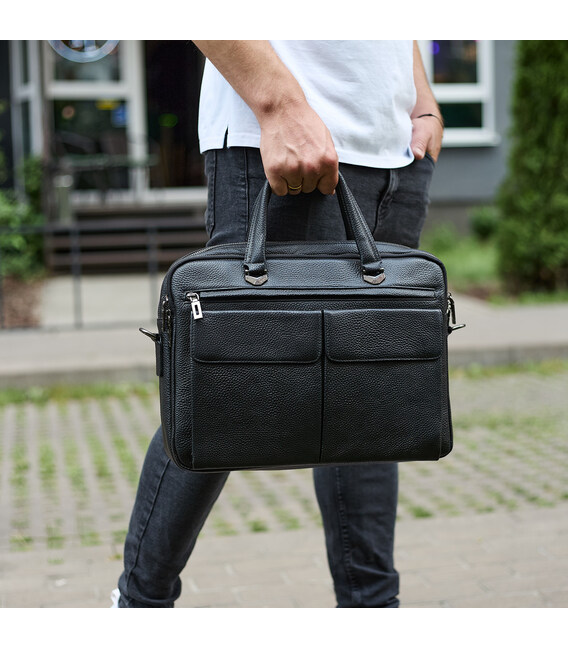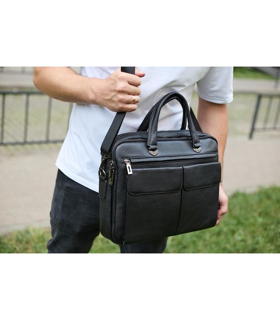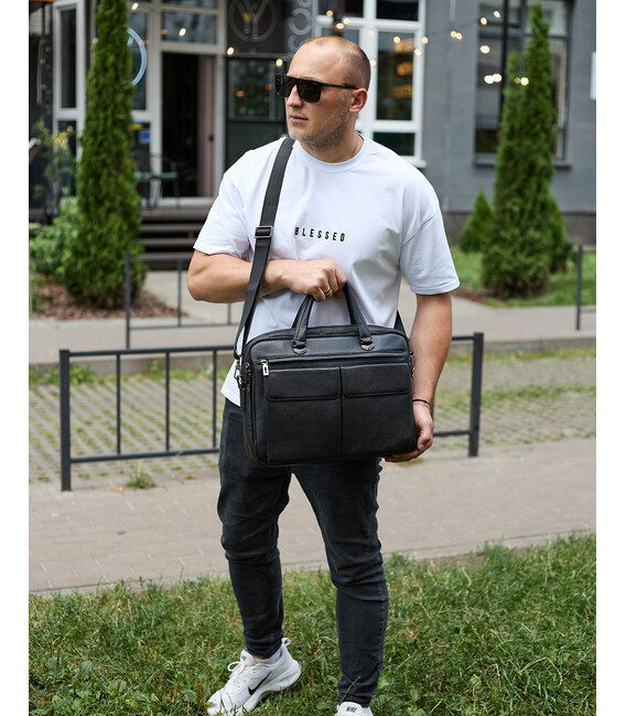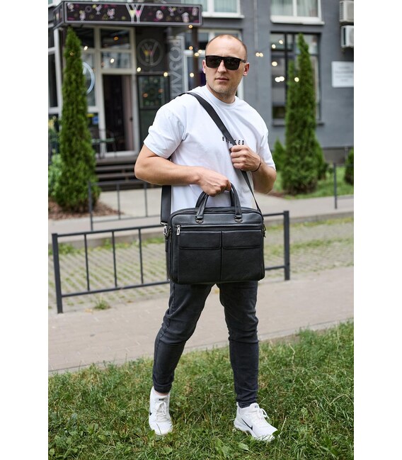Описание Сумка мужская офисная через плечо 39х29х10, практичный кожаный портфель для бизнеса, черный