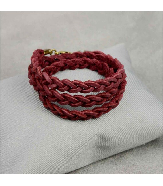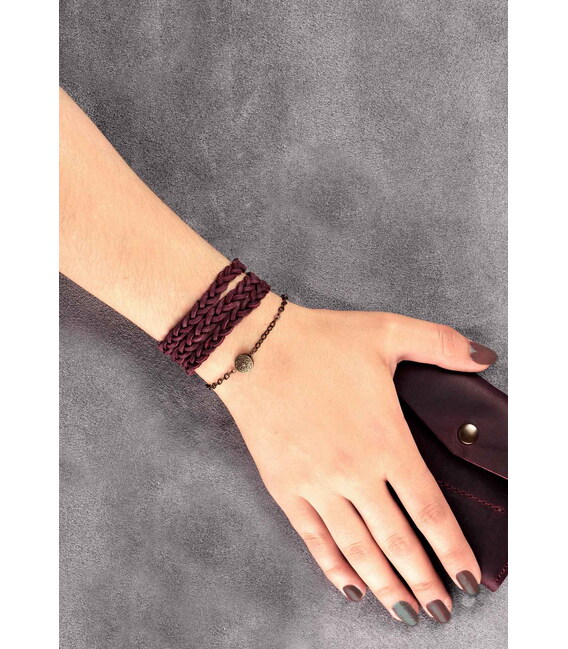 Описание Женский кожаный браслет тонкая косичка бордовый