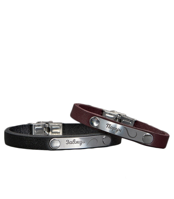 Представляем набор кожаных браслетов "Всегда рядом" в классических цветах: черный и бордовый.Кожаные браслеты изготовлены вручную с любовью и вниманием к деталям. Браслеты украшены стальными пластинами с надписью “Завжди поруч” и половинками сердечка, которые складываются в одно целое. Вы можете выбрать длину каждого браслета, чтобы он идеально подходил по размеру.Также доступна возможность изготовления изделий в других цветах по вашему выбору. Чтобы сделать заказ на браслеты в другом цветовом сочетании, позвоните менеджеру или укажите свои пожелания в комментарии к заказу.Эти браслеты станут прекрасным подарком не только для вашей второй половинки, но и для родных, друзей и всех, кого вы цените.Фурнитура и комплектация может быть изменена производителем