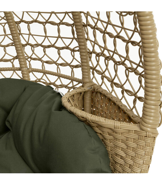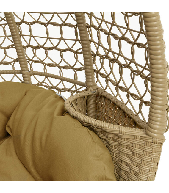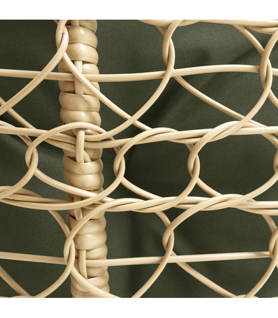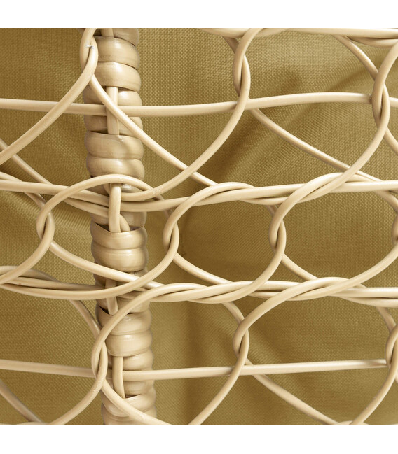 Крісло має стійку конструкцію з холоднокатаного металу й обплетене міцним ротангом із захистом від ультрафіолету. Каркас і опора покриті трикомпонентною фарбою, яка захищає від корозії, тому виріб можна розмістити як у приміщенні, так і просто неба.