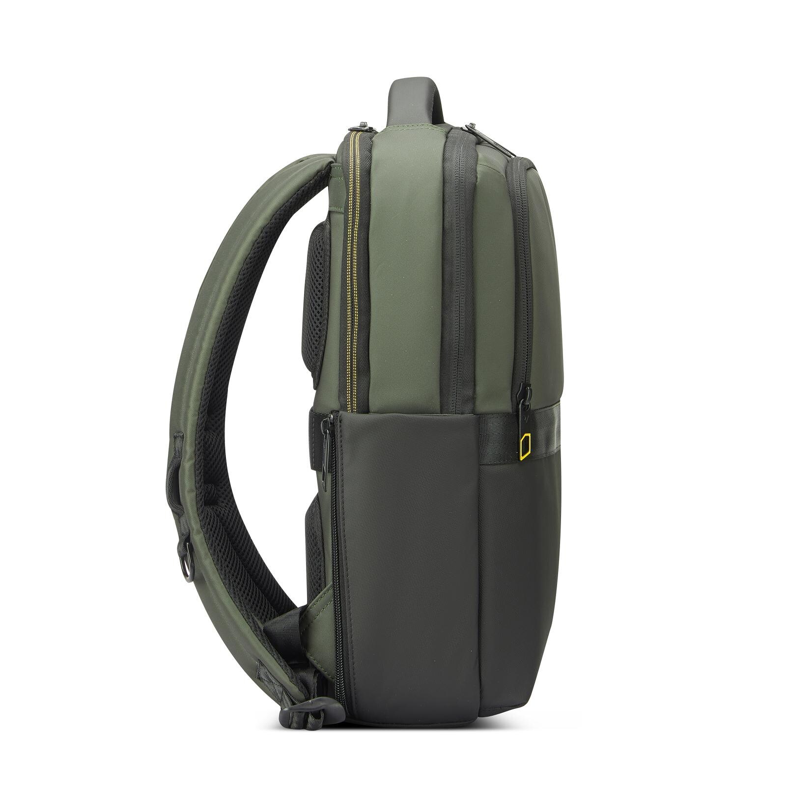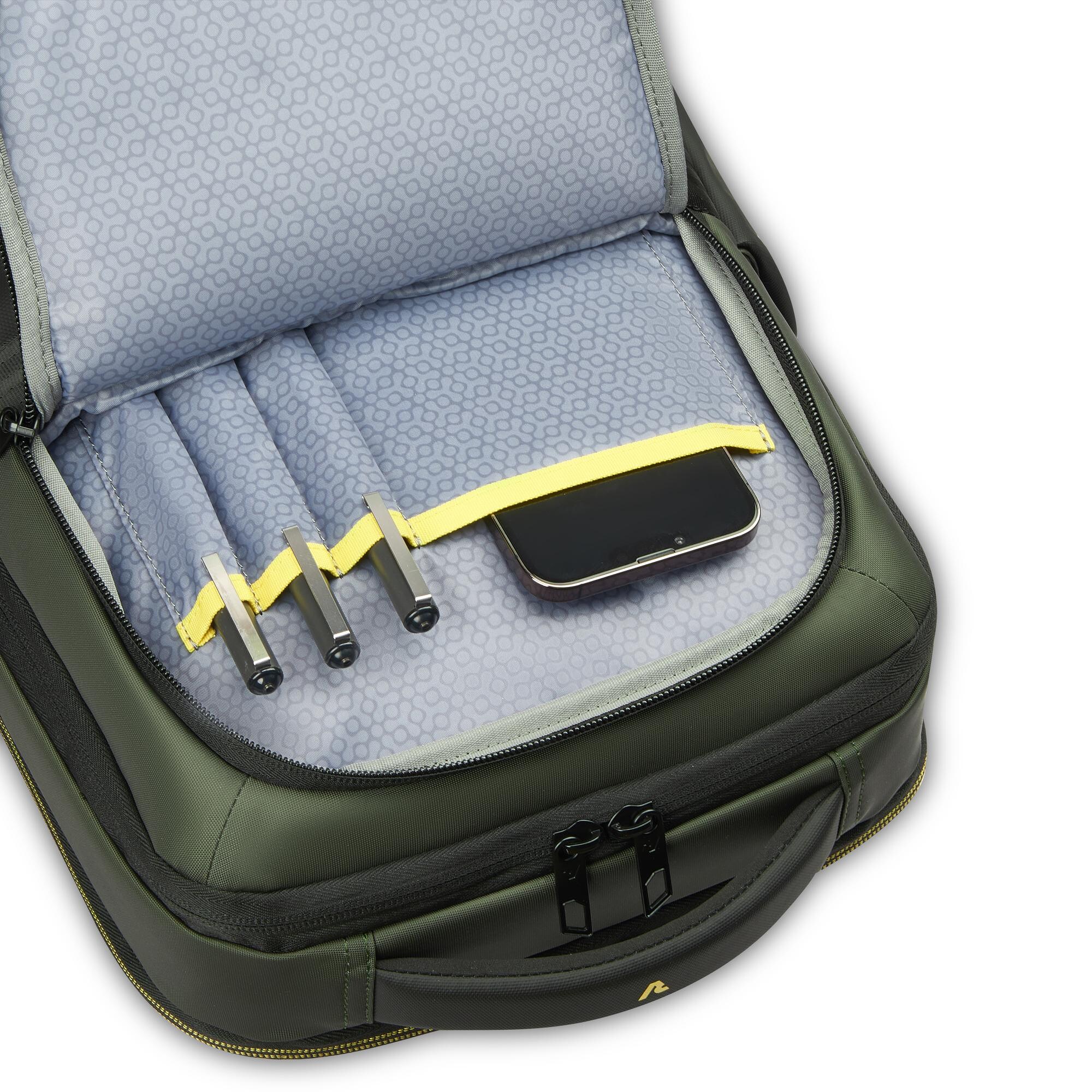 Рюкзак изготовлен из переработанной ткани PET и PU (пластик). Оснащен двумя основными отделами на молнии, где есть возможность разместить ноутбук, планшет, смартфон, пишущие предметы, визитные карточки и необходимые Вам вещи. Передняя часть изделия имеет, дополнительный, не большой карман с водонепроницаемой молнией, также присутствуют боковые карманы на молнии для зонтика, воды или других вещей. Задняя часть изделия оснащена умным рукавом для крепления на телескопическую ручку чемодана, дополнительно имеет мягкую спинку и плечевые ремни. Для удобства переноски оборудован противоскользящей ручкой.
