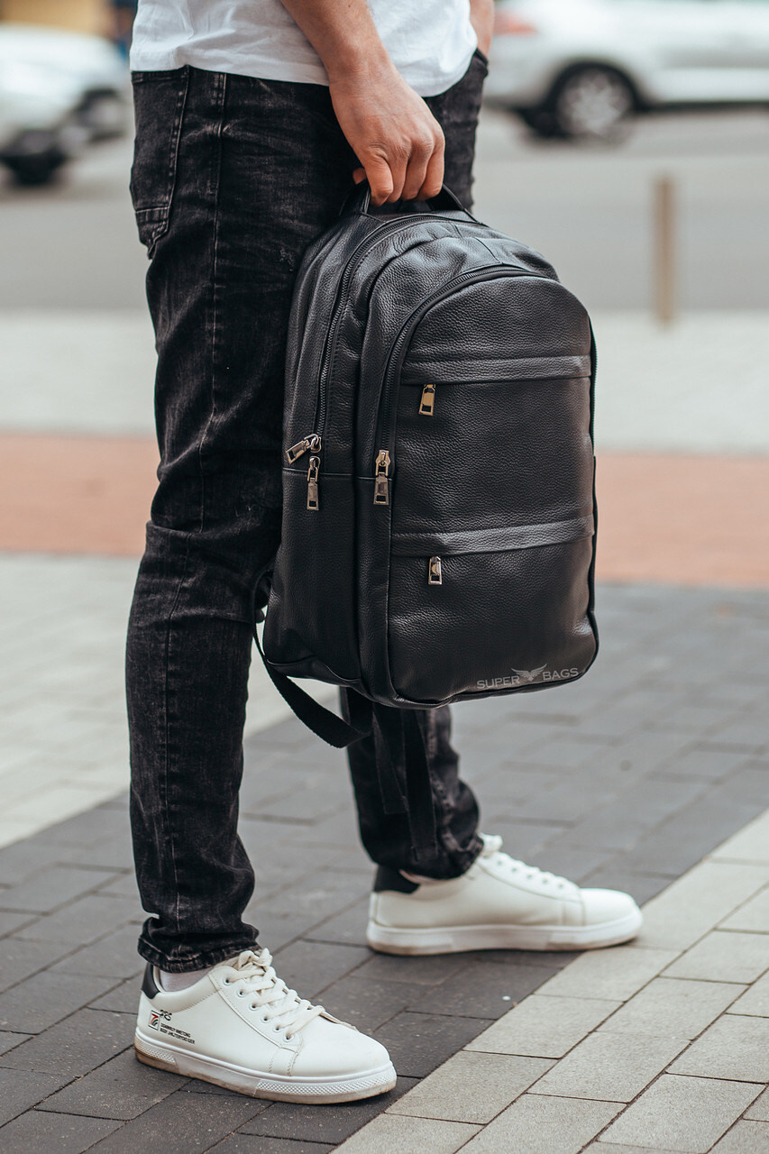 Рюкзак городской из натуральной кожи имеет 2 отделения на молнии, внутри 1 карман для телефона, кошелька или других нужных вещей. Рюкзак вмещает ноутбук. С лицевой стороны рюкзака - 2 кармана на молнии. С тыльной стороны - 1 горизонтальная карман на молнии. Подкладка - текстиль. Фурнитура - металл. Лямки из натуральной кожи регулируются по длине.