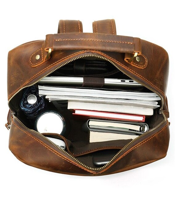 Вместительный кожаный рюкзак с эффектными потертостями. Аксессуар мягкий на ощупь. Кожа такого типа напоминает нубук. Отличный вариант для города, так и в поездку. Рюкзак очень хорошо носится и удобен в использовании. Цвет фурнитуры: золотистый. Подкладка данного аксессуара выполнена из прочного текстильного материала коричневого цвета. Есть удобная ручка для удобства в руке и лямки на плечи.