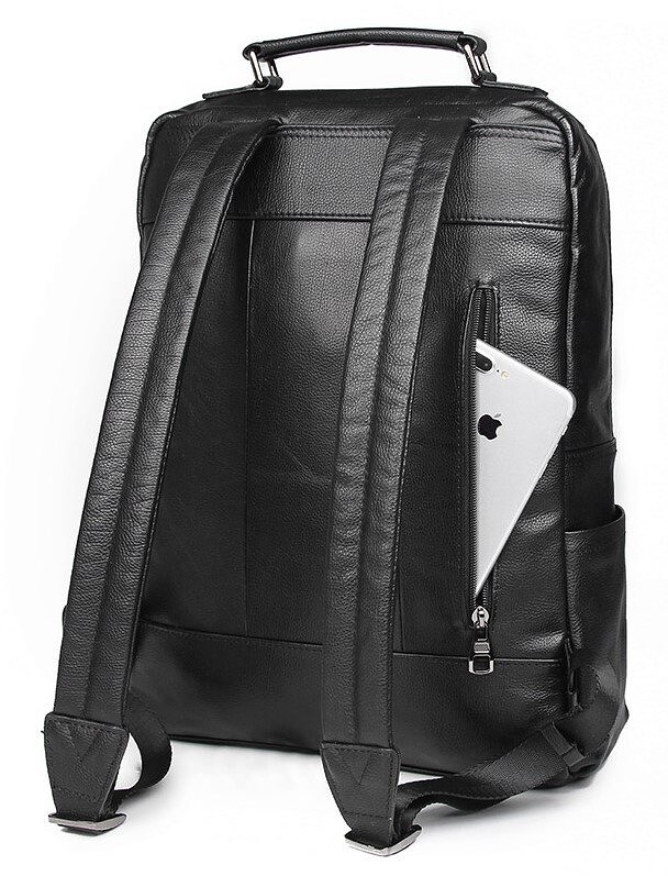Изделие выполнено из натуральной кожи высокого качества в черном цвете. Материал приятный на ощупь, отличается износостойкостью и хорошо подходит для активного ежедневного использования. Внутри предусмотрена плотная текстильная подкладка черного цвета, а качественная фурнитура гармонично дополняет общий дизайн модели. Рюкзак удобно носить как на плечах, так и в руке благодаря короткой кожаной ручке.