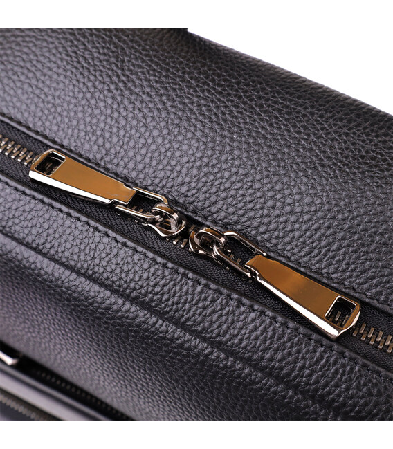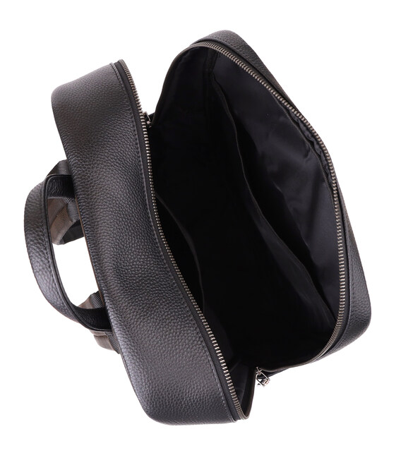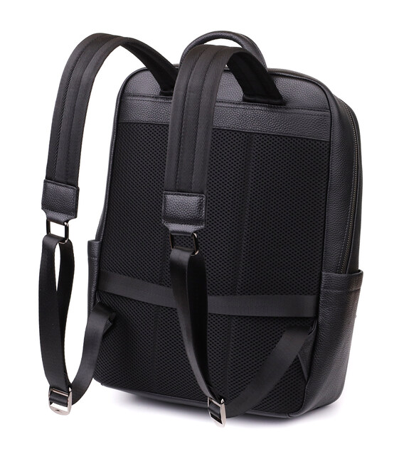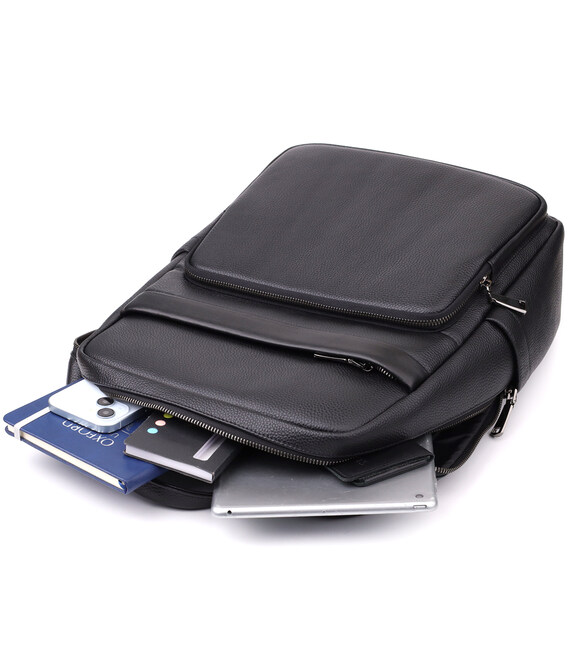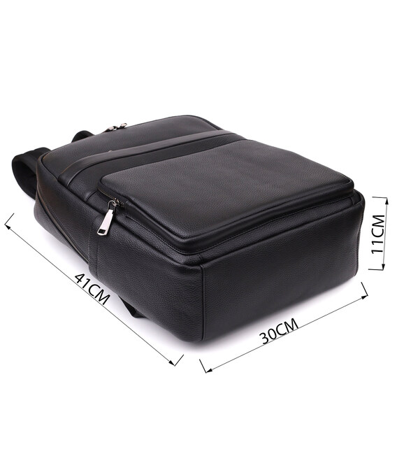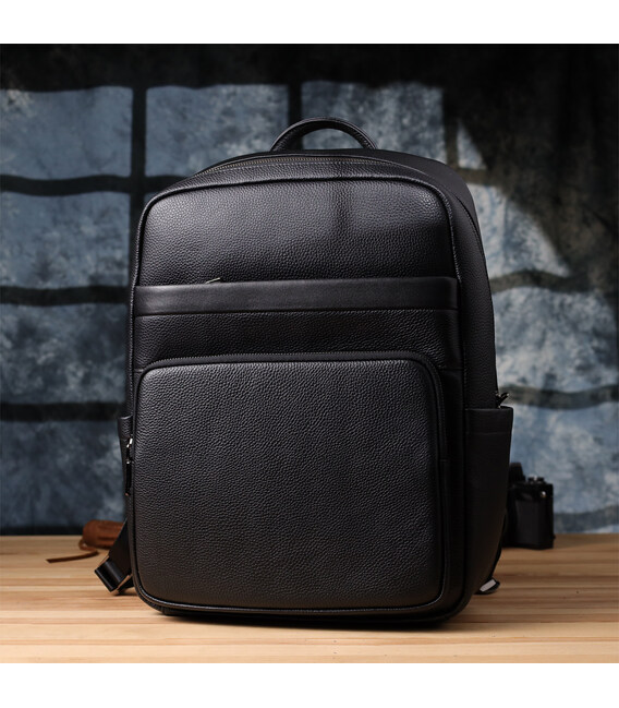 Большой кожаный рюкзак создан для тех, кто ценит комфорт и функциональность. Он оснащён одним просторным основным отделением на молнии с двумя бегунками, внутри которого находятся два кармана открытого типа и один карман на молнии для удобной организации мелких вещей. На лицевой стороне расположены накладной и встроенный карманы, закрывающиеся на молнию, а по бокам — два дополнительных кармана для аксессуаров и бутылки воды.