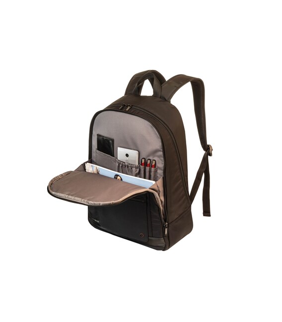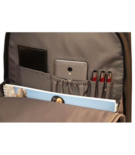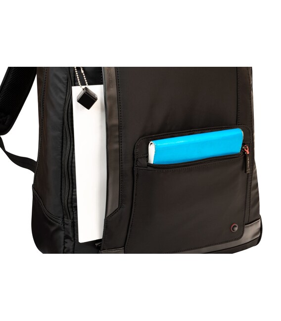 У рюкзака есть два отделения на молнии. В одном отделении со сдерживающими углами предусмотрен мини-офис. Второе отделение оснащено местом для ноутбука 15,6“ и планшета, есть глубокий карман на молнии.