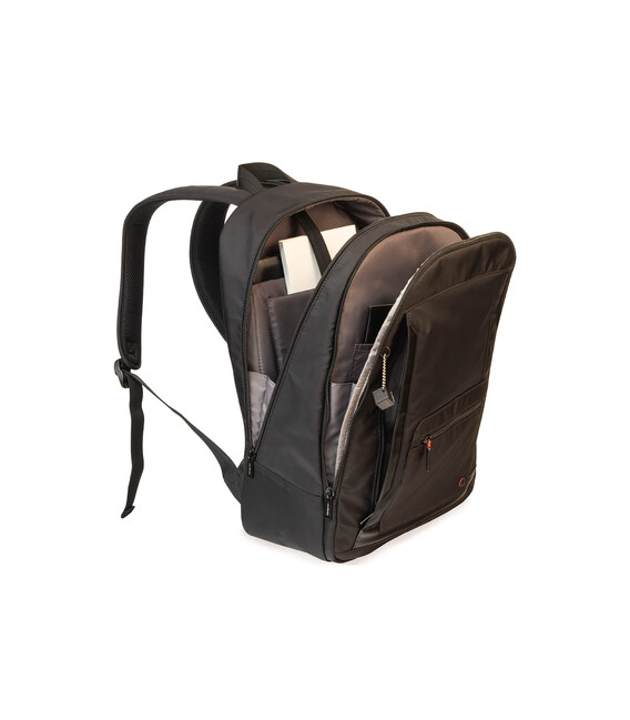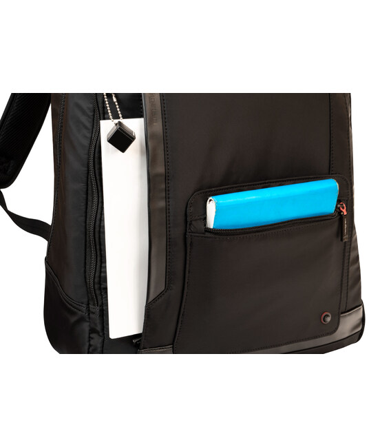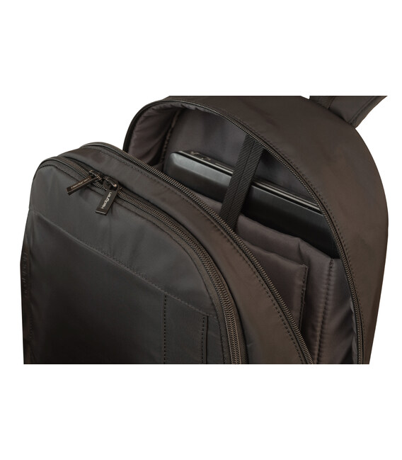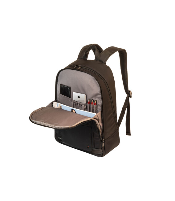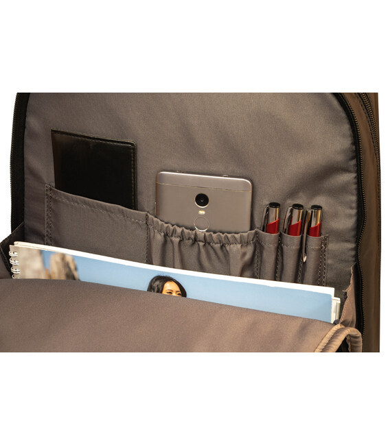 У рюкзака есть два отделения на молнии. В одном отделении со сдерживающими углами предусмотрен мини-офис. Второе отделение оснащено местом для ноутбука 13“ и планшета, есть глубокий карман на молнии.