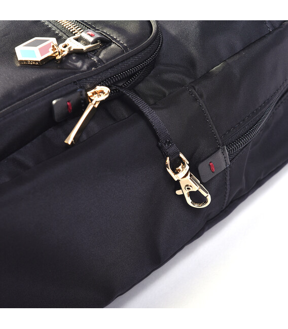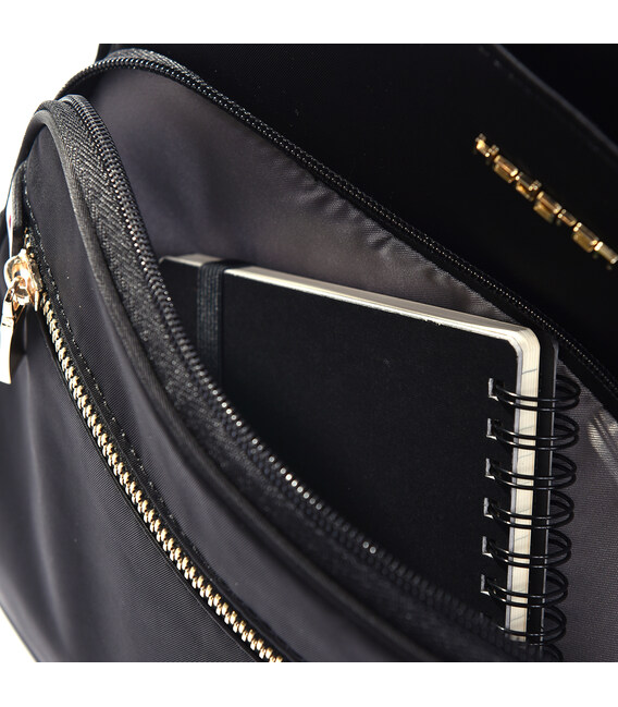 Компактный рюкзак оснащен вместительным основным отделением на молнии. Внутри карман для смартфона и дополнительный внутренний карман на молнии. На наружной части расположен глубокий карман и дополнительно еще два кармана с золотистой молнией и фирменным брелком. Плечевые ремни мягкие и удобно регулируются, а комфорт переноски добавляет дополнительная верхняя ручка из кожи.
