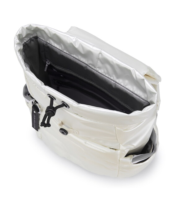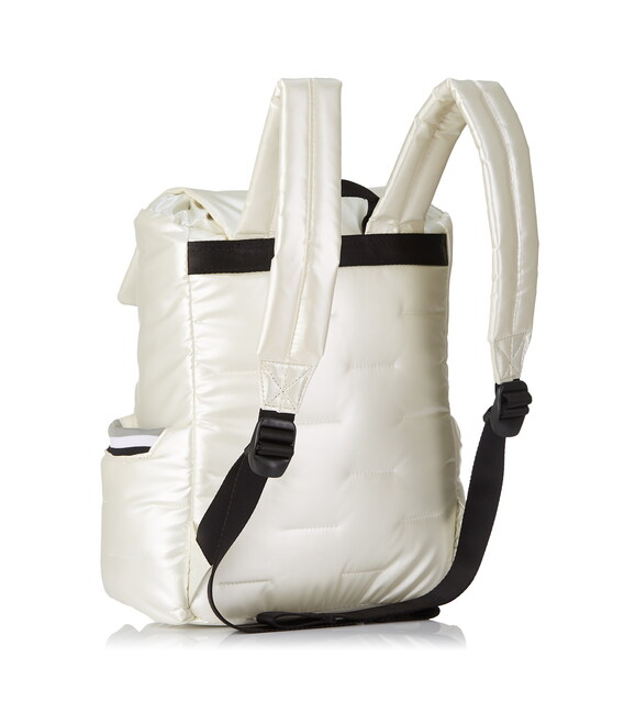 Вместительный, дутый рюкзак-идеальный спутник на каждый день. Оснащен большим основным отделением с внутренними карманами и съёмной косметичкой. С внешней стороны расположен карман на молнии, также есть боковые карманы для зонтика или бутылки с карабином для ключей. Выполнена из плотного 100% polyester.