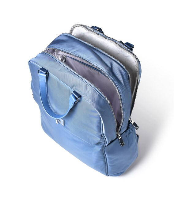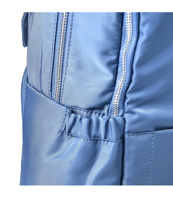 Женский, городской рюкзак, среднего размера. Оснащен наружным карманом на клапане с карабином для ключей, вместительным основным отделением на молнии где размещен отдел для телефона и дополнительный карман на молнии с RFID-защитой. Второе отделение предназначено для ноутбука 14" и документов формата А4. Также содержит боковые карманы для зонта или бутылки. На задней стороне рюкзака размещен умный рукав для крепления на телескопическую ручку чемодана. Рюкзак выполнен из 100% переработанного полиэстера PET (полиэфирная ткань из переработанных пластиковых бутылок).