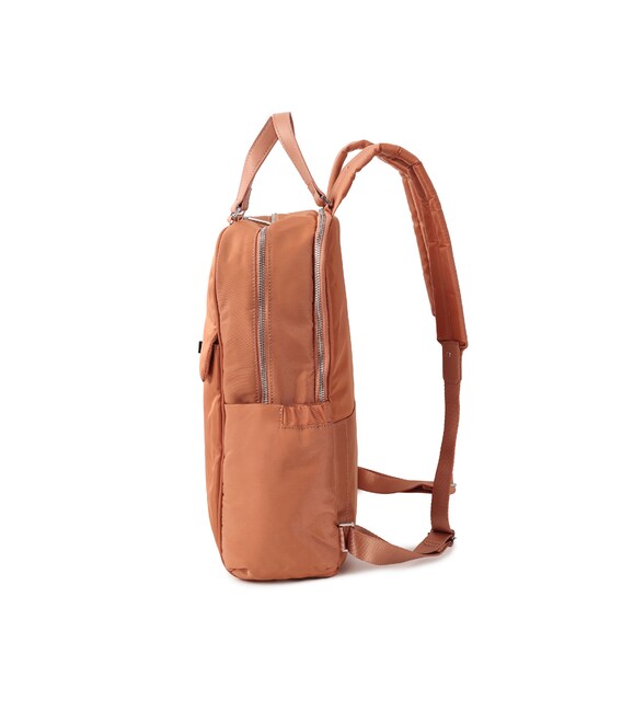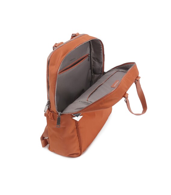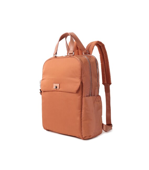 Женский, городской рюкзак, среднего размера. Оснащен наружным карманом на клапане с карабином для ключей, вместительным основным отделением на молнии где размещен отдел для телефона и дополнительный карман на молнии с RFID-защитой. Второе отделение предназначено для ноутбука 14" и документов формата А4. Также содержит боковые карманы для зонта или бутылки. На задней стороне рюкзака размещен умный рукав для крепления на телескопическую ручку чемодана. Рюкзак выполнен из 100% переработанного полиэстера PET (полиэфирная ткань из переработанных пластиковых бутылок).