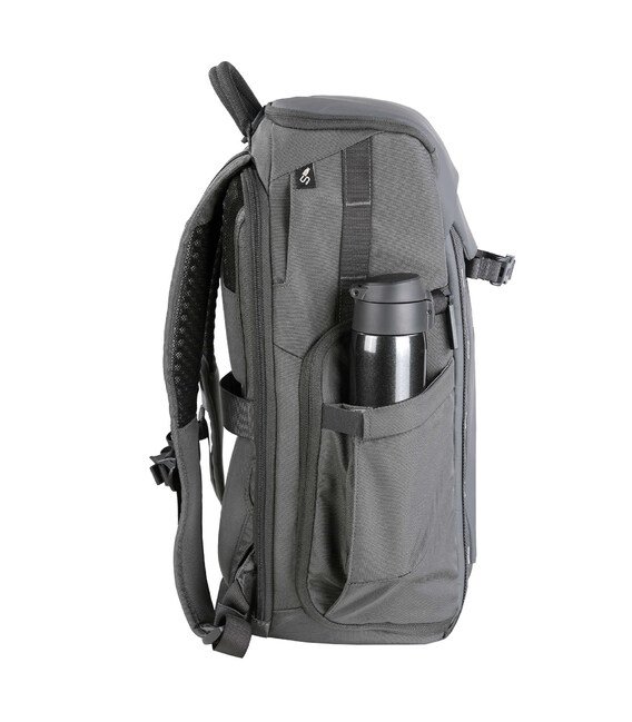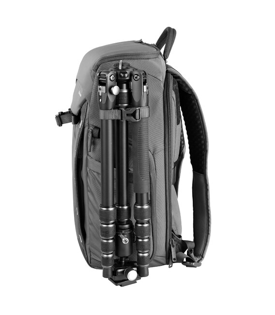 - Боковые карманы на эластичной стяжке и ремешок на верхней петле позволяют зафиксировать небольшой полноразмерный штатив с каждой стороны рюкзака;