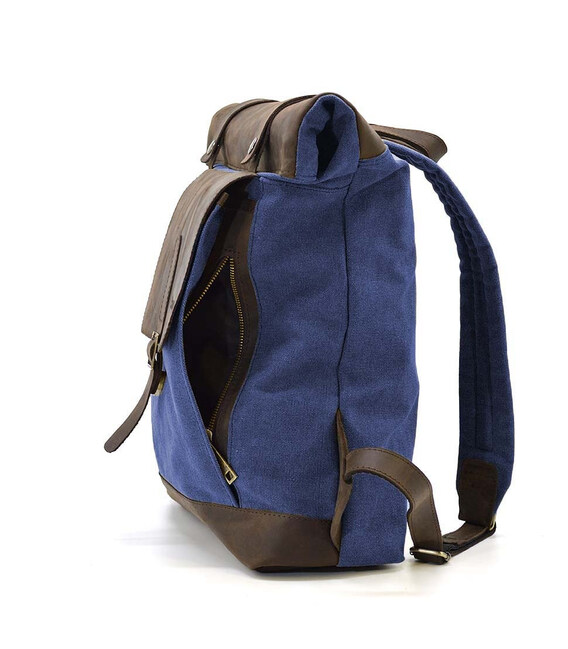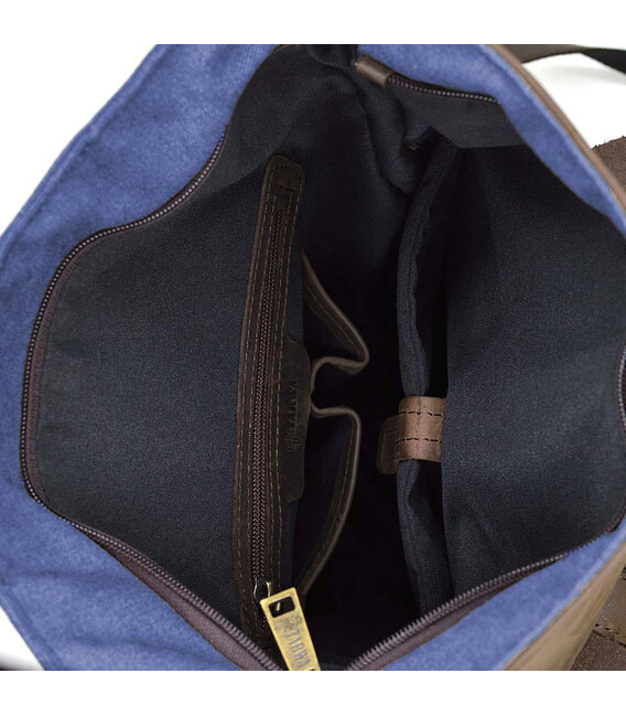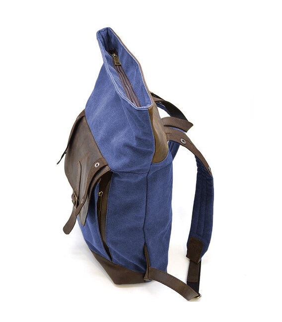 Ролл-ап рюкзак зі шкіри і синій канвас TARWA RKc-5191-3md - рюкзак зі верхньою горловиною, що скручується. Закривається основне відділення на блискавку плюс скручування з двома шкіряними фіксаторами з боків.