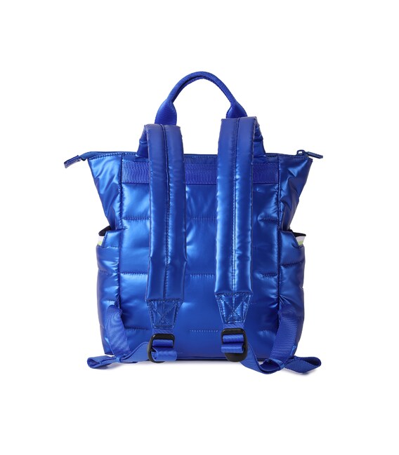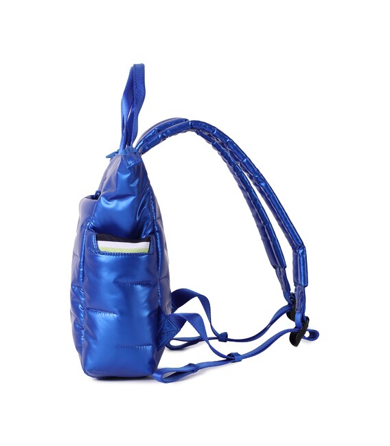 Вместительный, дутый рюкзак-идеальный спутник на каждый день. Оснащен большим основным отделением с внутренними карманами и съёмной косметичкой. С внешней стороны расположен карман на молнии, также есть боковые карманы для зонтика или бутылки с карабином для ключей. Выполнен из плотного 100% polyester.