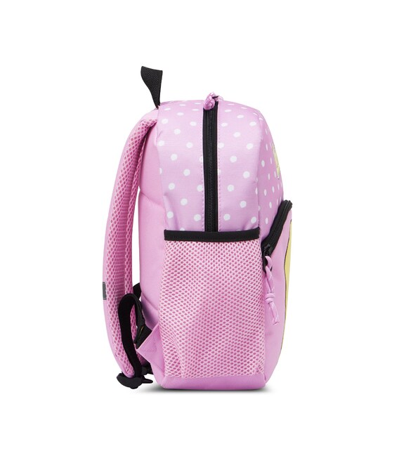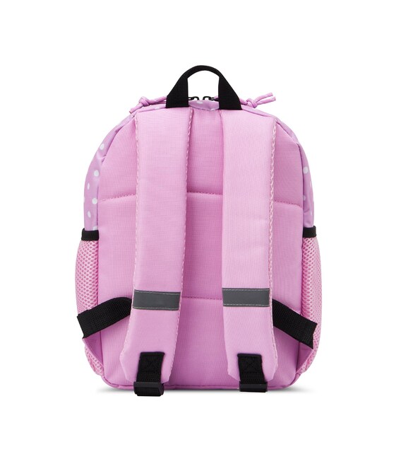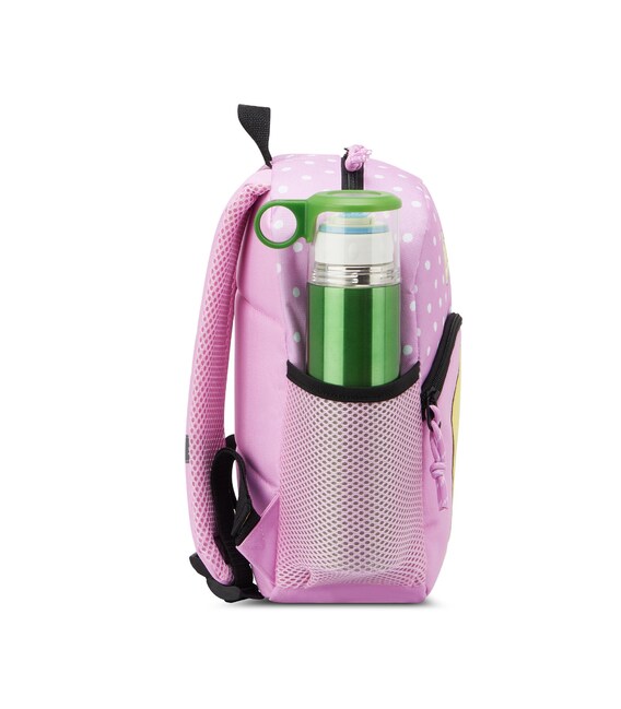 Вместительный детский рюкзак оснащен большим основным отделом и двумя дополнительными наружными на молнии. Для удобства перемещения предусмотрена подъемная ручка на верхней панели. Имеет мягкую спинку и плечевые ремни, также на плечевых ремнях присутствуют светоотражающие элементы. Дополнительно предусмотрены боковые карманы для бутылки или зонтики.